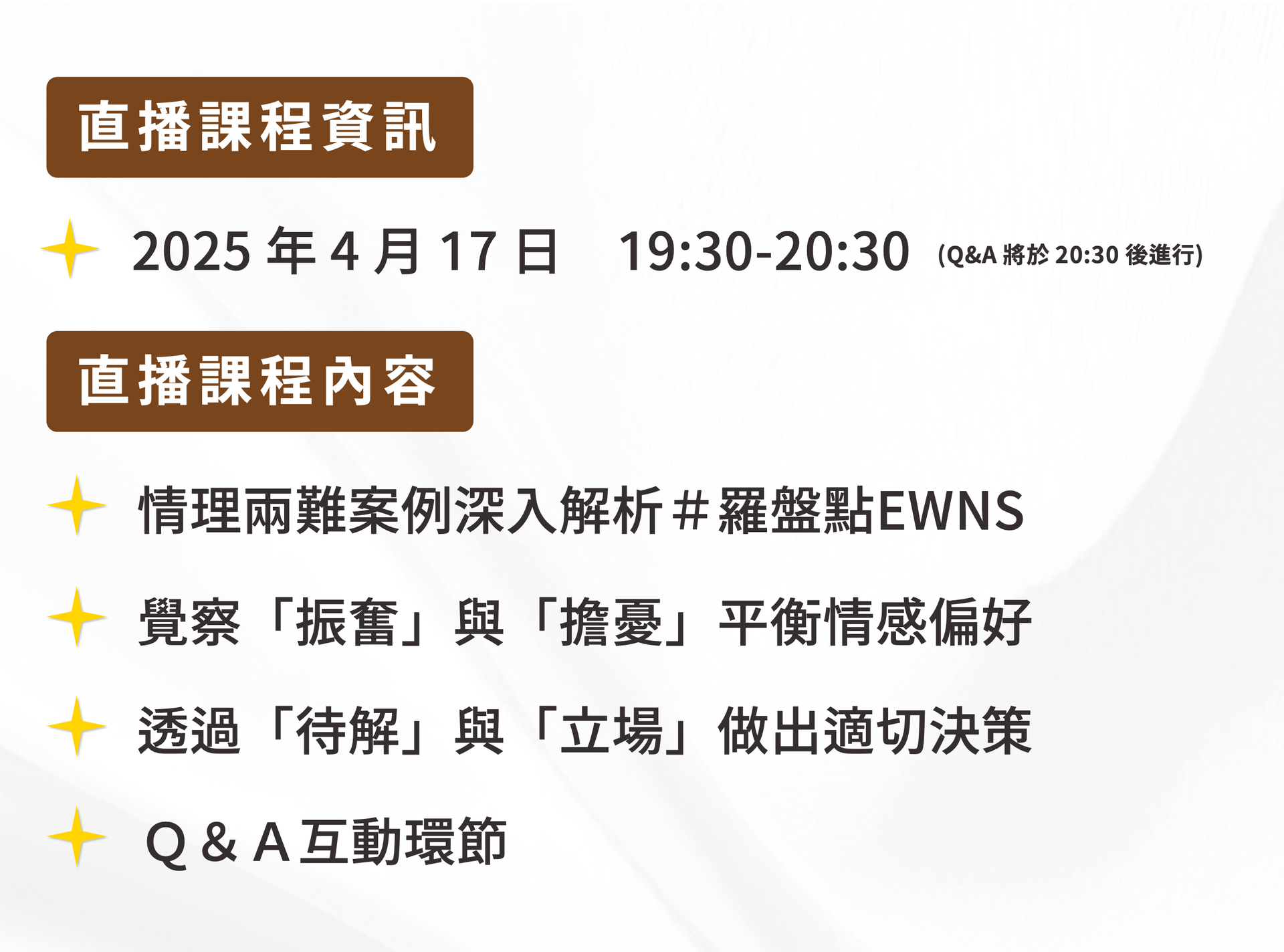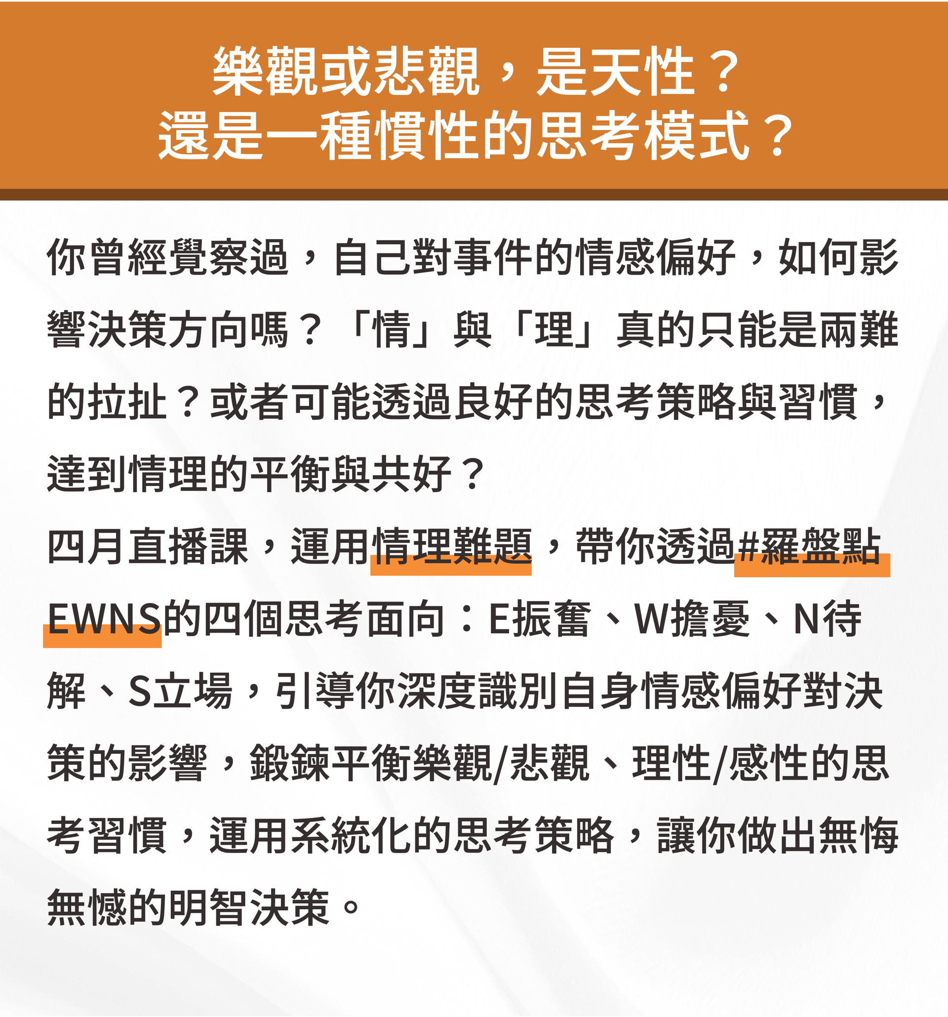 以情理兩難的生活案例,帶領學員靈活應用思考歷程#羅盤點EWNS